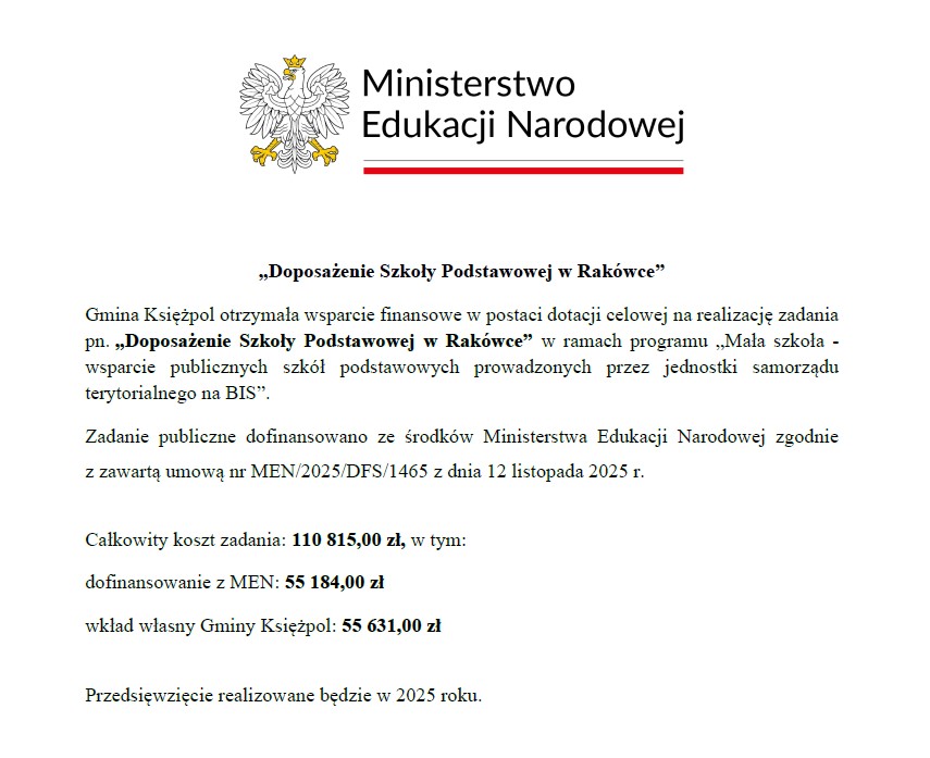 Zadanie publiczne pn. „Doposażenie Szkoły Podstawowej w Rakówce” dofinansowano ze środków Ministerstwa Edukacji Narodowej zgodnie z zawarta umową nr MEN/2025/DFS/1465 z dnia 12.11.2025 r.