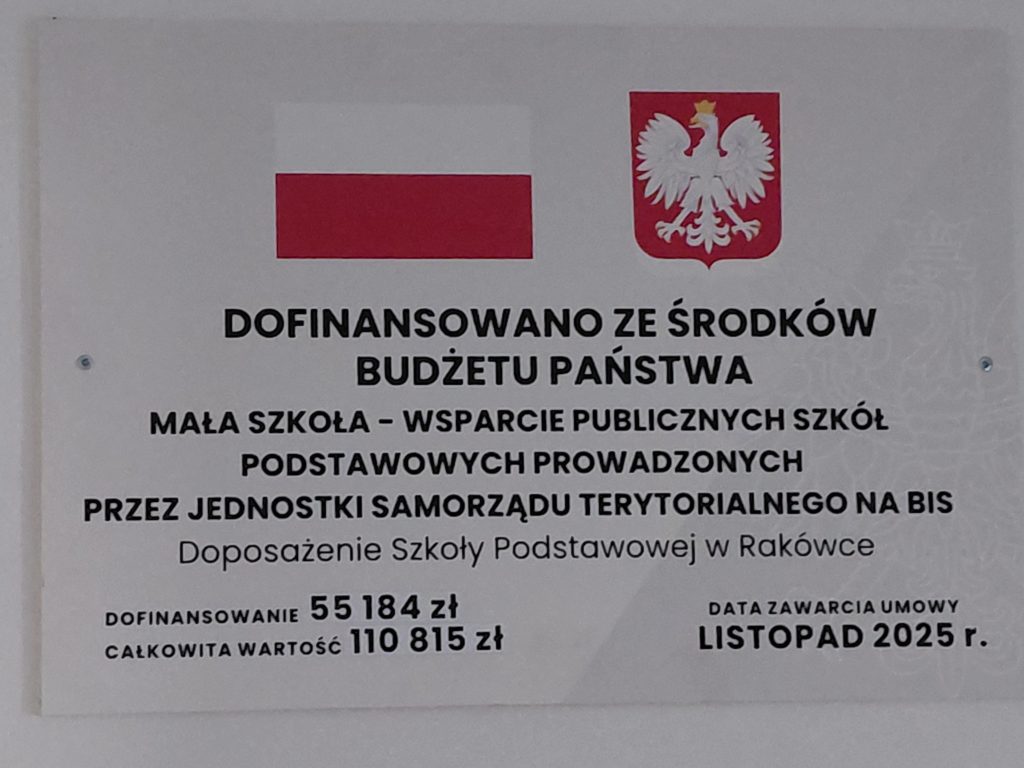 Zadanie publiczne pn. „Doposażenie Szkoły Podstawowej w Rakówce” dofinansowano ze środków Ministerstwa Edukacji Narodowej zgodnie z zawarta umową nr MEN/2025/DFS/1465 z dnia 12.11.2025 r.